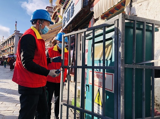 国网拉萨供电公司共产党员服务队检查八廓北街分支箱。